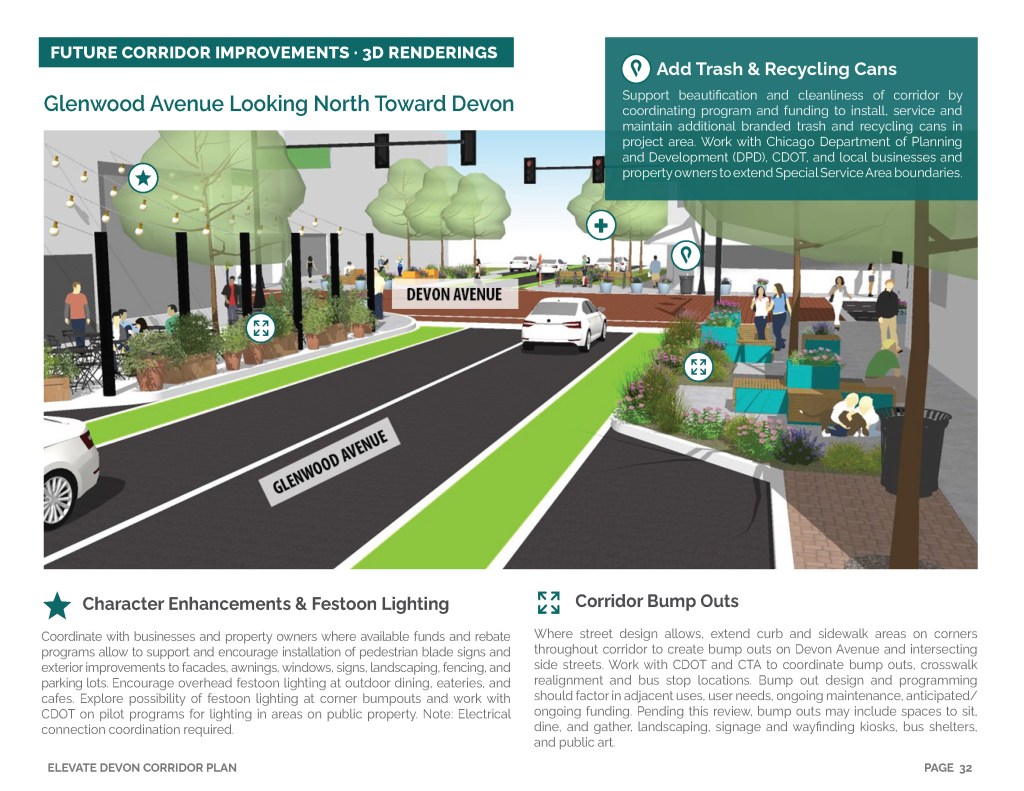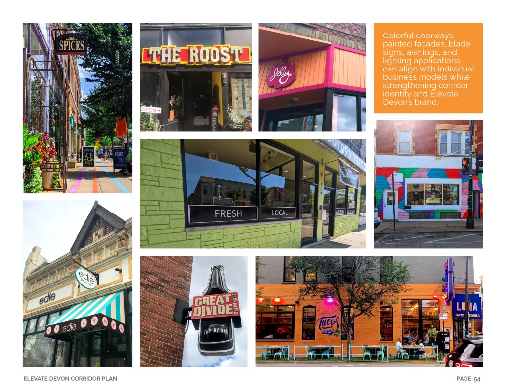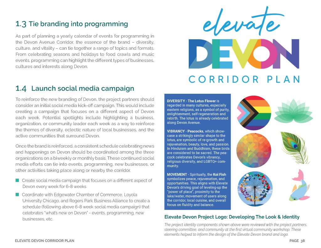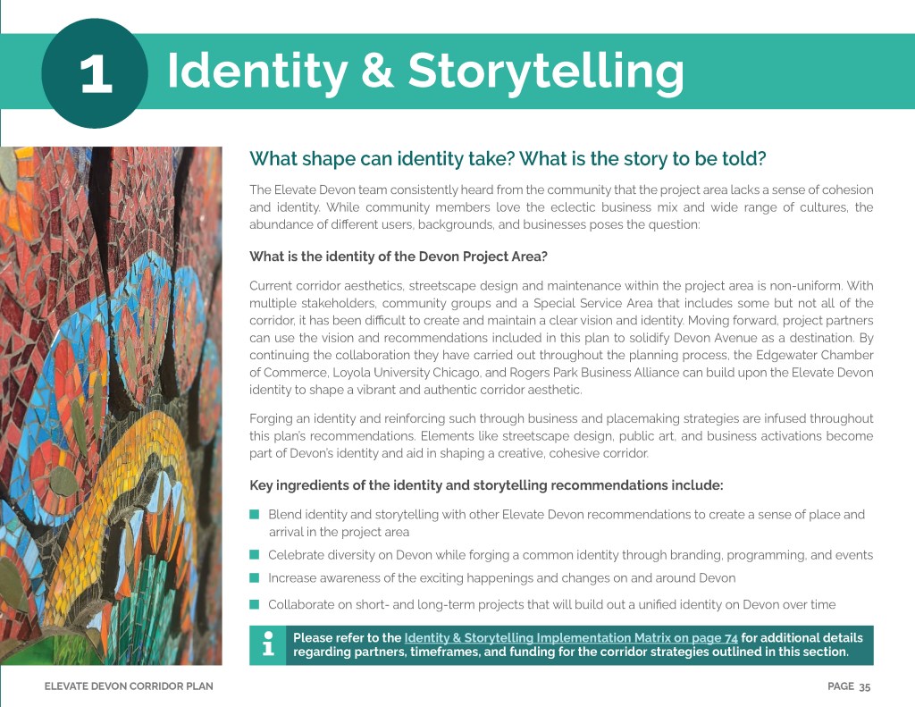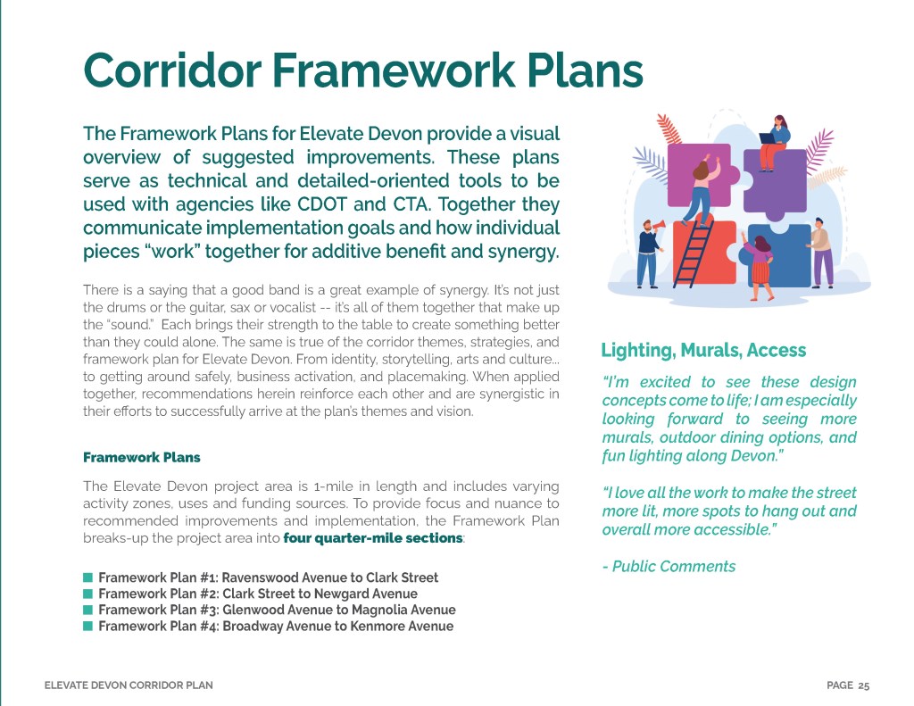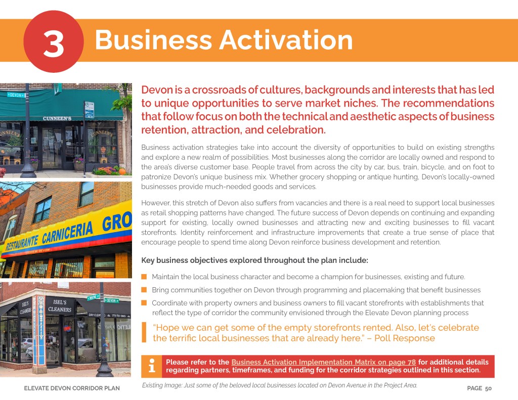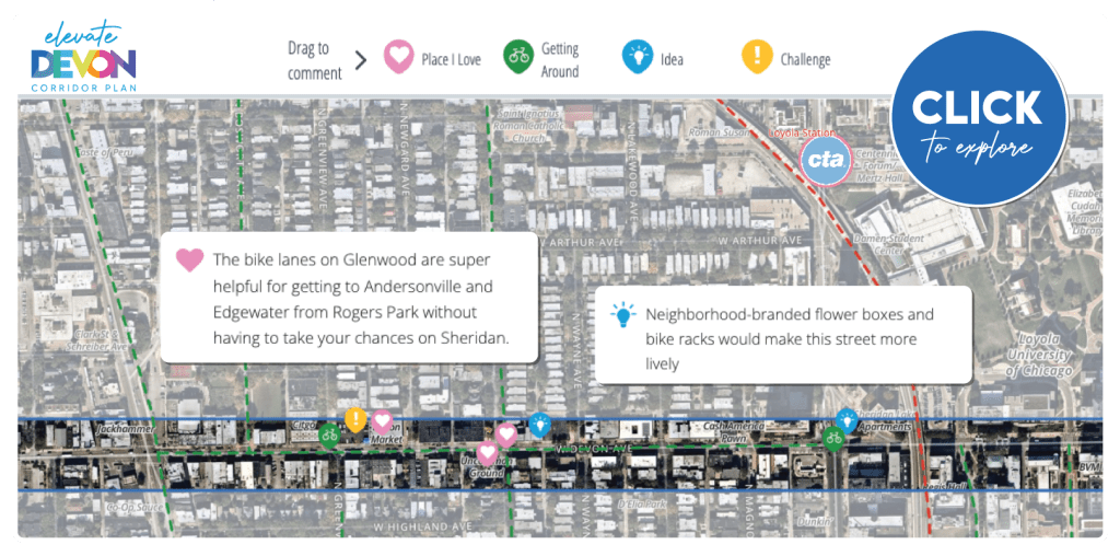 Elevate Devon is a pivotal corridor study focused on enhancing Devon Avenue between Sheridan Road and Ravenswood Avenue in Chicago. Between January and August of 2022 the community came together to identify and prioritize strategies to enliven the eclectic 1-mile project area, foster sense of place, and help local businesses thrive. During the Fall and Winter of 2022 the project team worked diligently to apply community feedback, connect with local partners and city agencies, and draft the plan. Review and refinements were completed in early January of 2023 and we are excited to share the approved Elevate Devon Corridor Plan with the community. On behalf the Edgewater Chamber of Commerce, Loyola University Chicago, Rogers Park Business Alliance, and design and planning team at Teska Associates — thank you for your support and participation.