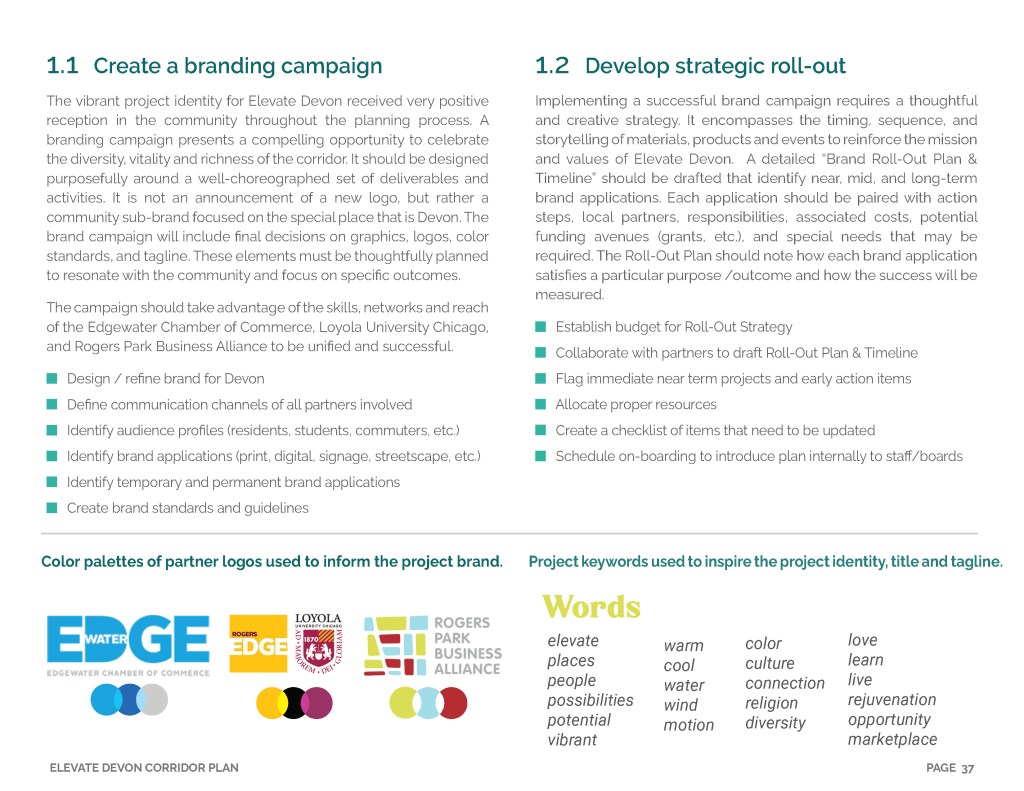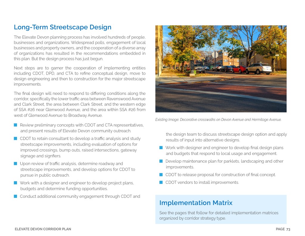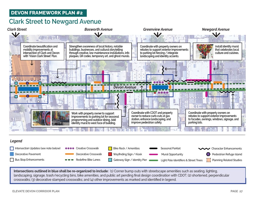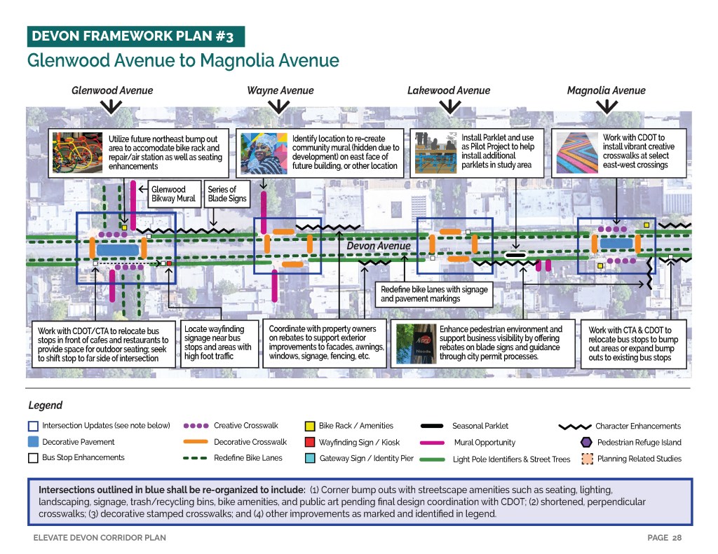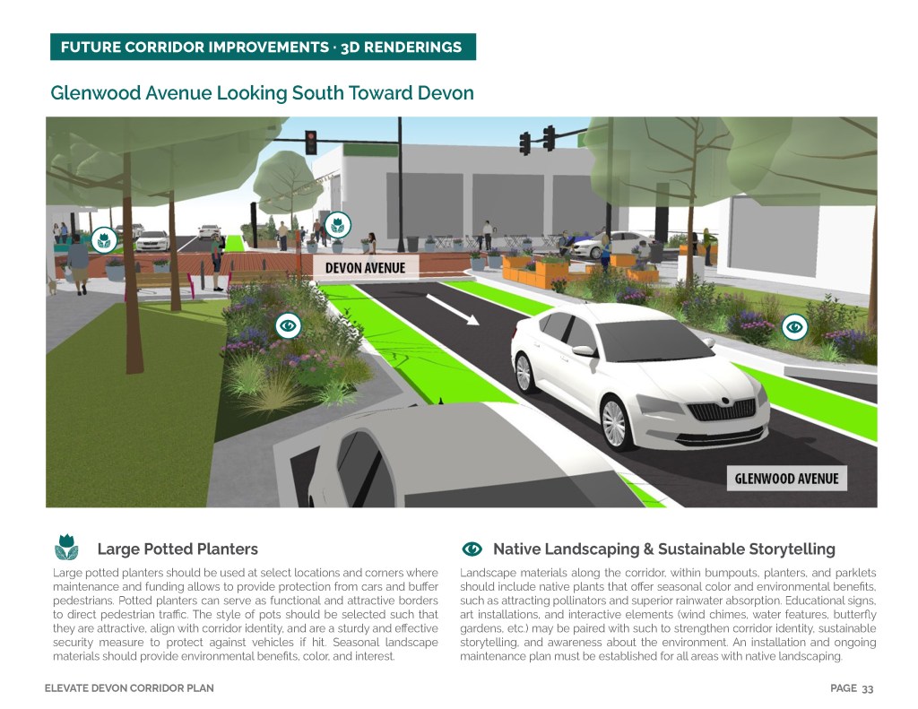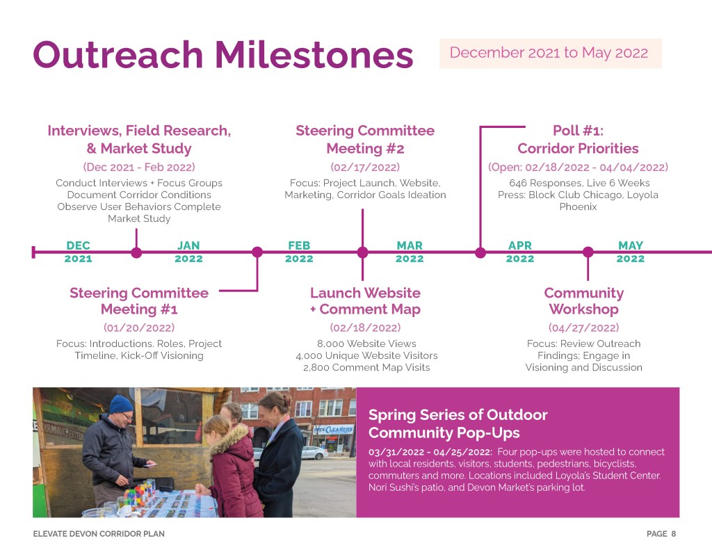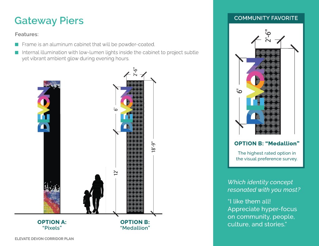 Elevate Devon is a pivotal corridor study focused on enhancing Devon Avenue between Sheridan Road and Ravenswood Avenue in Chicago. Between January and August of 2022 the community came together to identify and prioritize strategies to enliven the eclectic 1-mile project area, foster sense of place, and help local businesses thrive. During the Fall and Winter of 2022 the project team worked diligently to apply community feedback, connect with local partners and city agencies, and draft the plan. Review and refinements were completed in early January of 2023 and we are excited to share the approved Elevate Devon Corridor Plan with the community. On behalf the Edgewater Chamber of Commerce, Loyola University Chicago, Rogers Park Business Alliance, and design and planning team at Teska Associates — thank you for your support and participation.