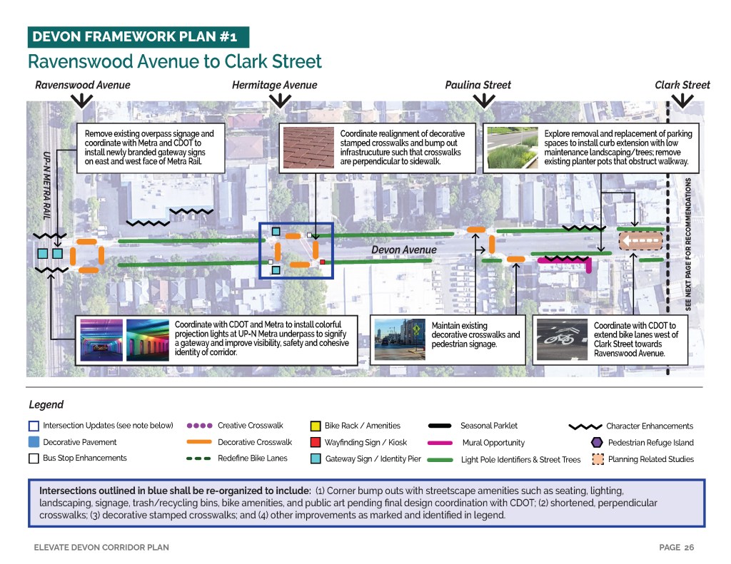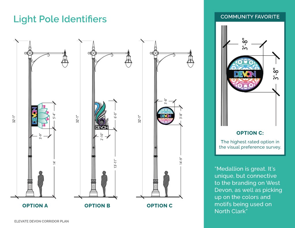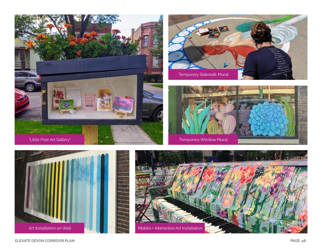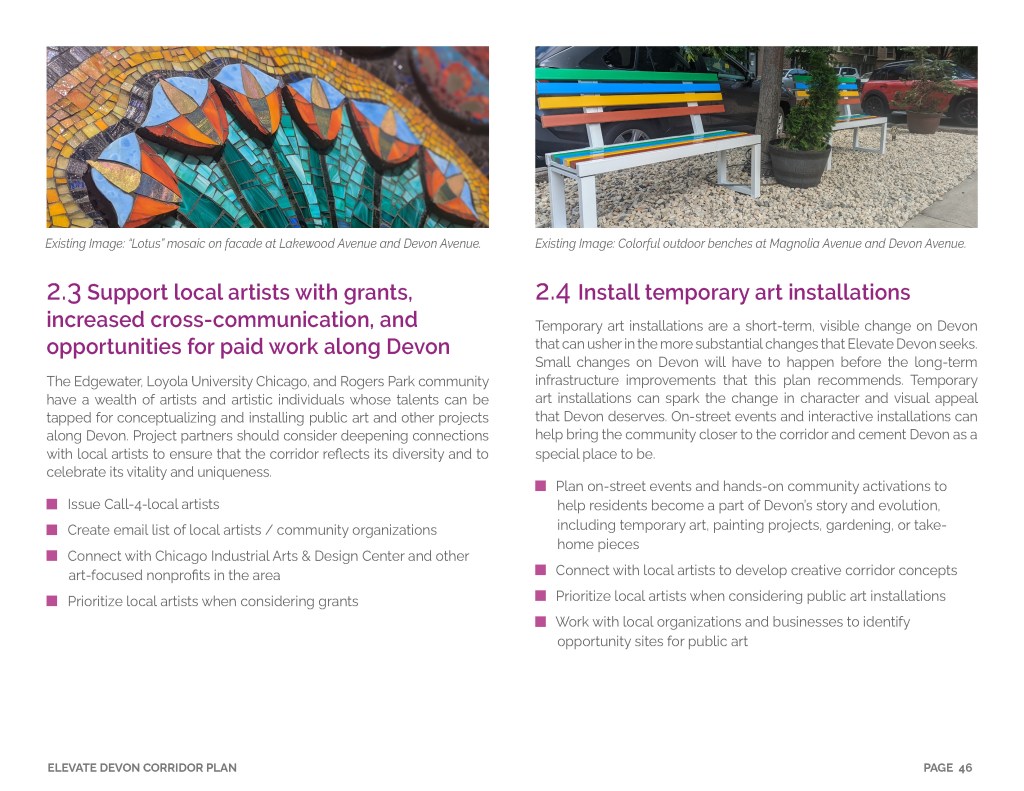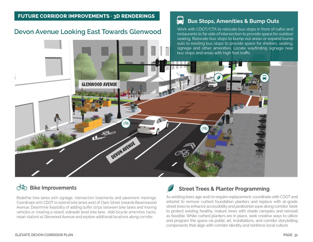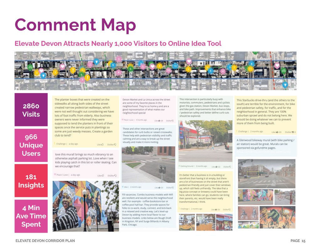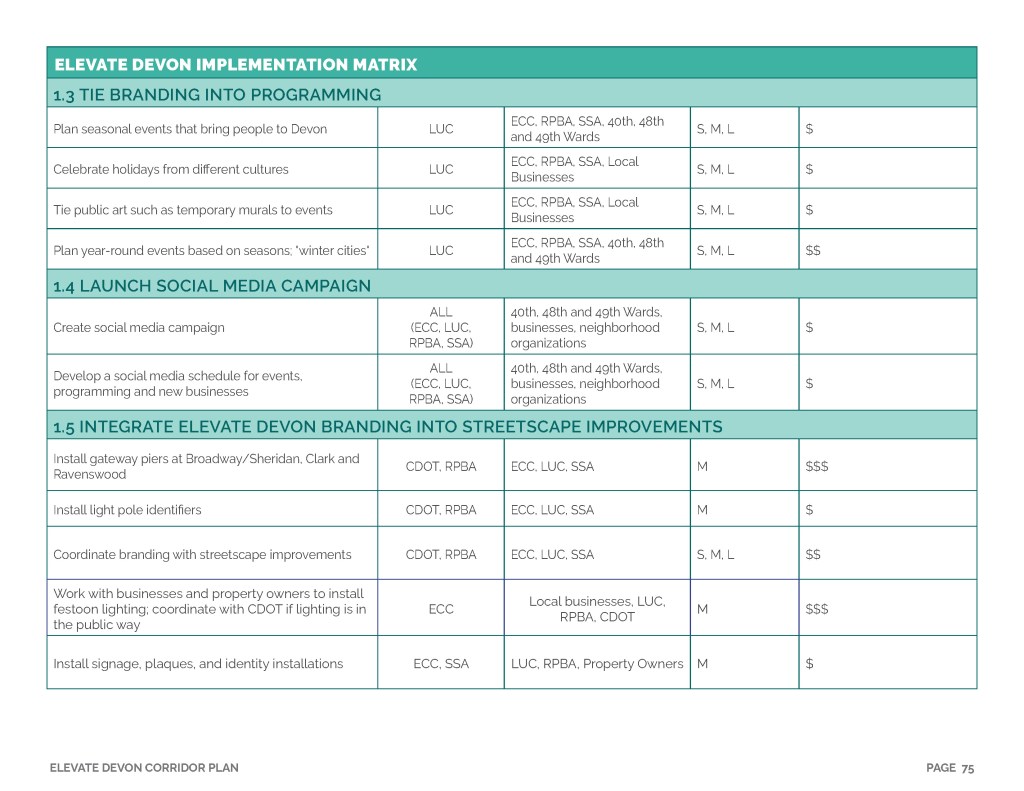 Elevate Devon is a pivotal corridor study focused on enhancing Devon Avenue between Sheridan Road and Ravenswood Avenue in Chicago. Between January and August of 2022 the community came together to identify and prioritize strategies to enliven the eclectic 1-mile project area, foster sense of place, and help local businesses thrive. During the Fall and Winter of 2022 the project team worked diligently to apply community feedback, connect with local partners and city agencies, and draft the plan. Review and refinements were completed in early January of 2023 and we are excited to share the approved Elevate Devon Corridor Plan with the community. On behalf the Edgewater Chamber of Commerce, Loyola University Chicago, Rogers Park Business Alliance, and design and planning team at Teska Associates — thank you for your support and participation.
