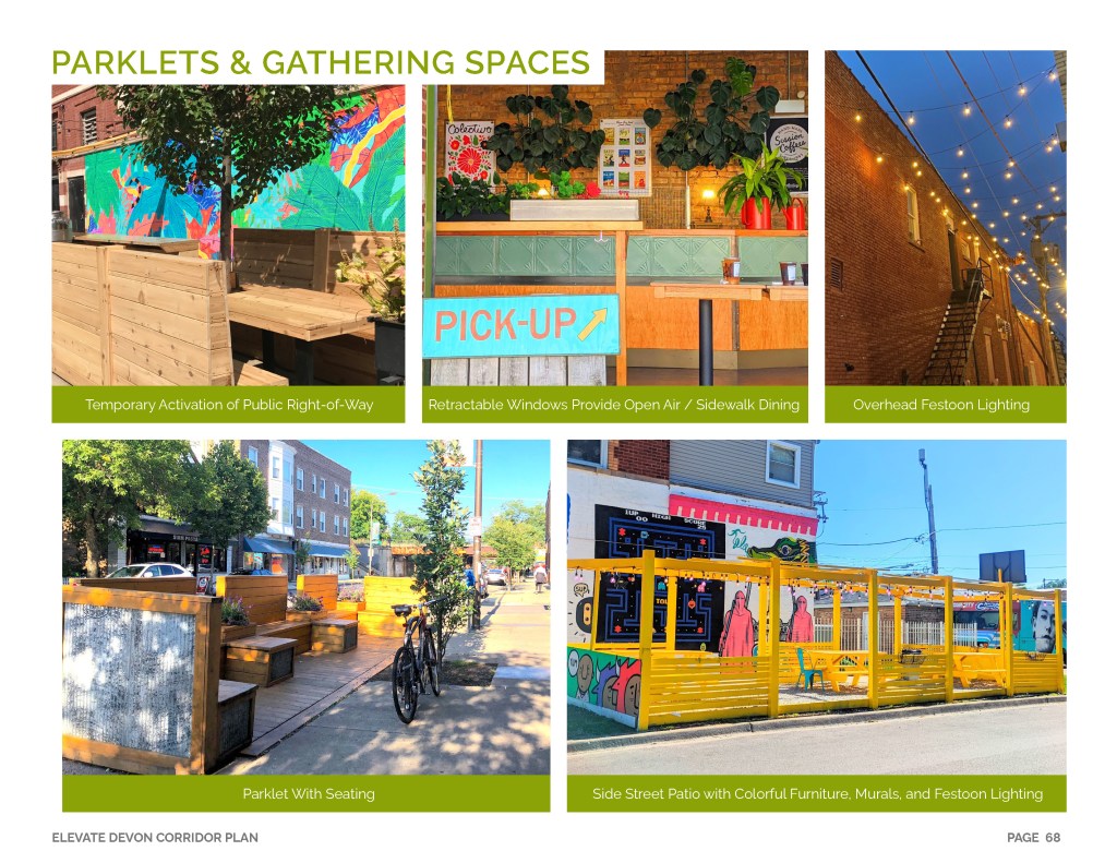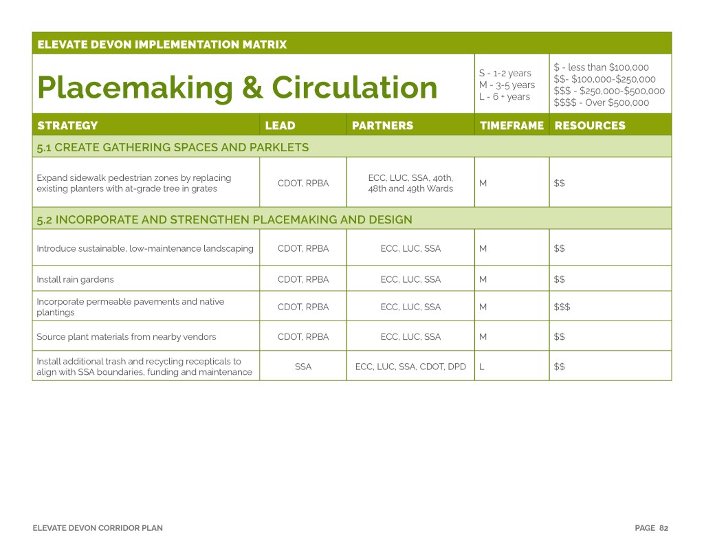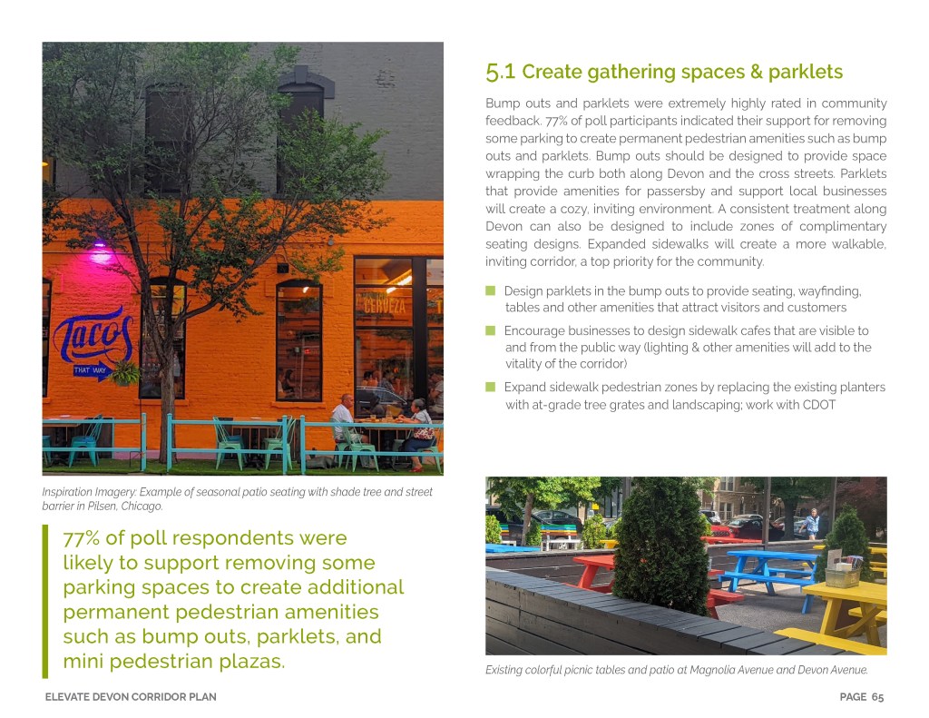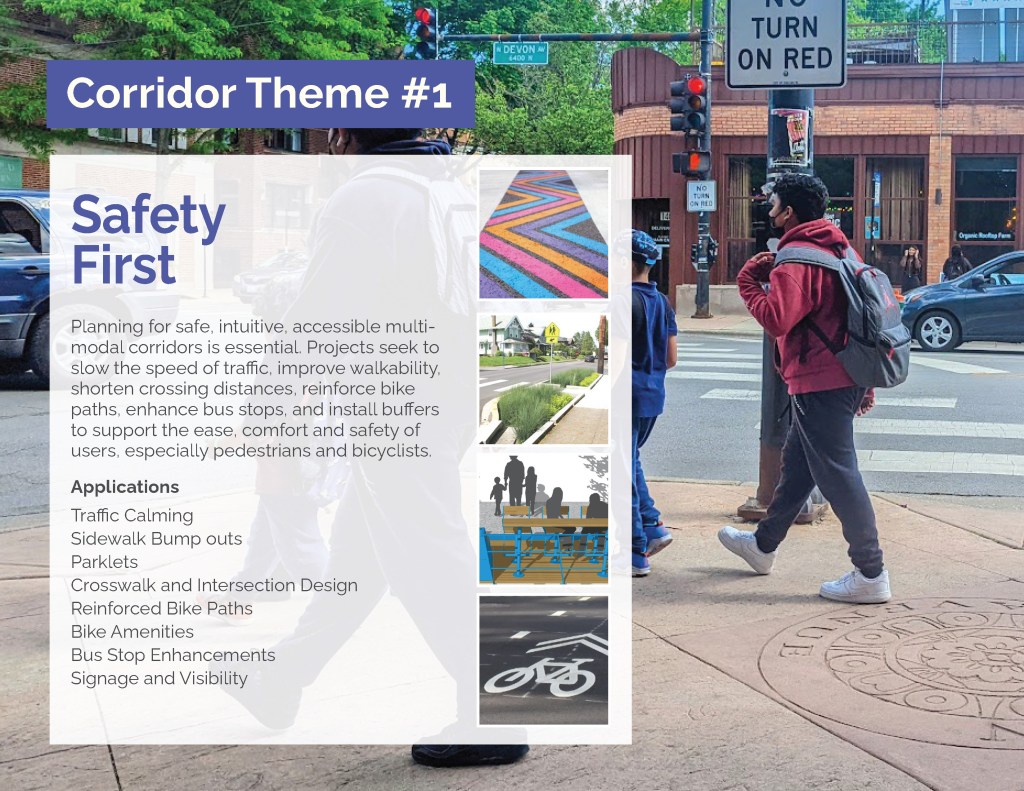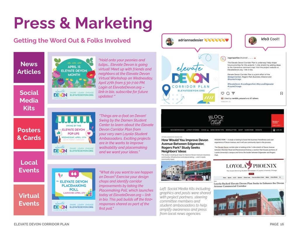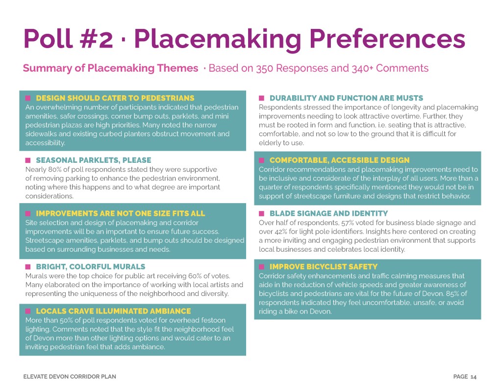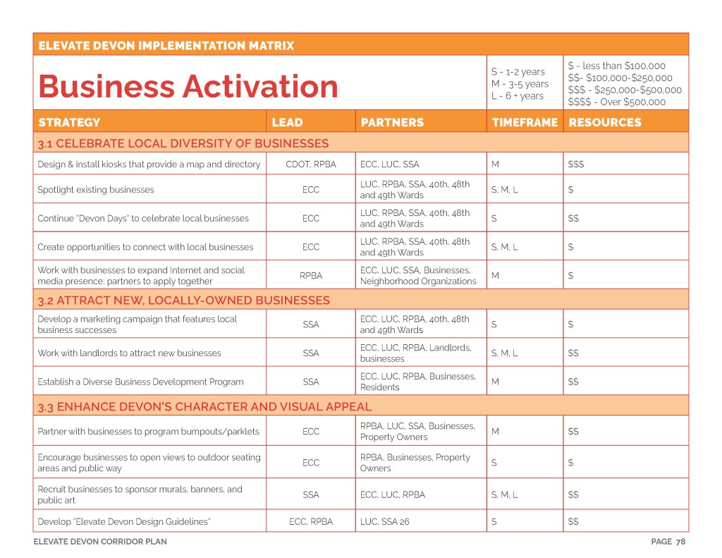 Elevate Devon is a pivotal corridor study focused on enhancing Devon Avenue between Sheridan Road and Ravenswood Avenue in Chicago. Between January and August of 2022 the community came together to identify and prioritize strategies to enliven the eclectic 1-mile project area, foster sense of place, and help local businesses thrive. During the Fall and Winter of 2022 the project team worked diligently to apply community feedback, connect with local partners and city agencies, and draft the plan. Review and refinements were completed in early January of 2023 and we are excited to share the approved Elevate Devon Corridor Plan with the community. On behalf the Edgewater Chamber of Commerce, Loyola University Chicago, Rogers Park Business Alliance, and design and planning team at Teska Associates — thank you for your support and participation.