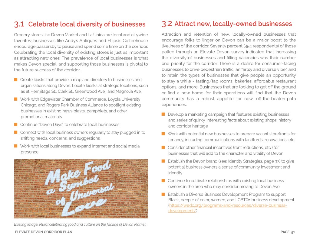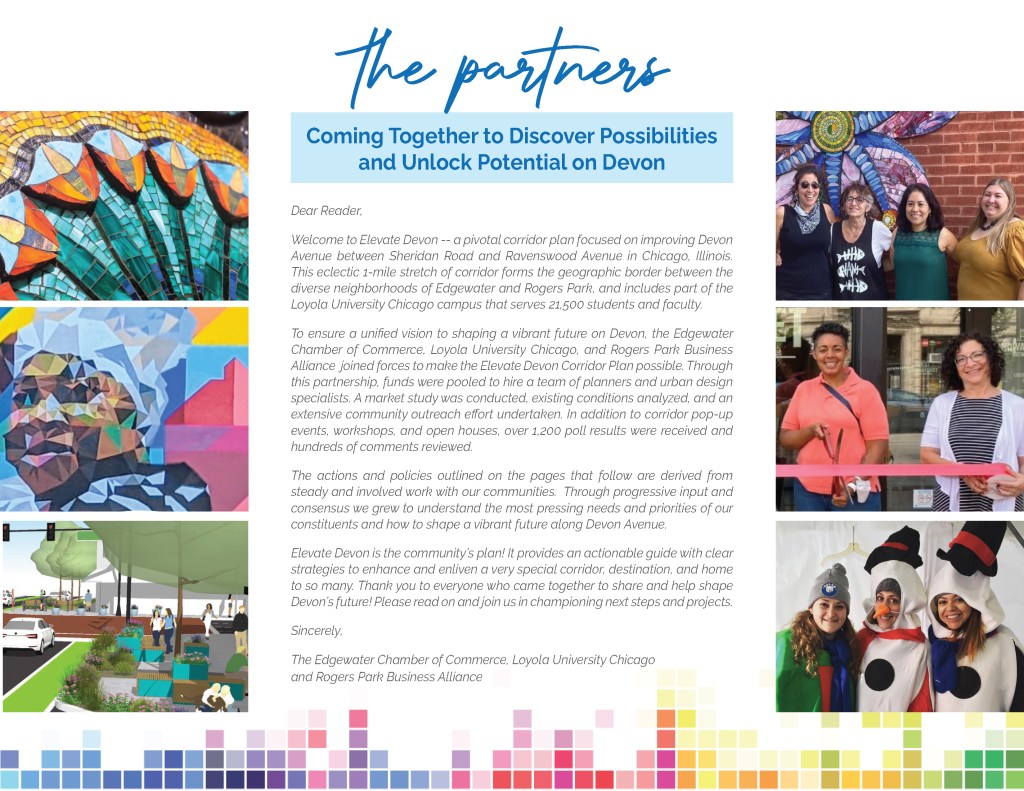 Drumroll … … … The Rogers Park Business Alliance (RPBA), Edgewater Chamber of Commerce (ECC) and Loyola University Chicago (LUC) are proud to announce the release of the Elevate Devon Corridor Plan — a pivotal multi-year strategic plan focused on improving Devon Avenue between Sheridan Road and Ravenswood Avenue. Biggest of thanks to the hundreds of community members, businesses and partners who shared input and took part in the Corridor Visioning Process. We couldn’t have done it with out you. Cheers to the future of Devon!