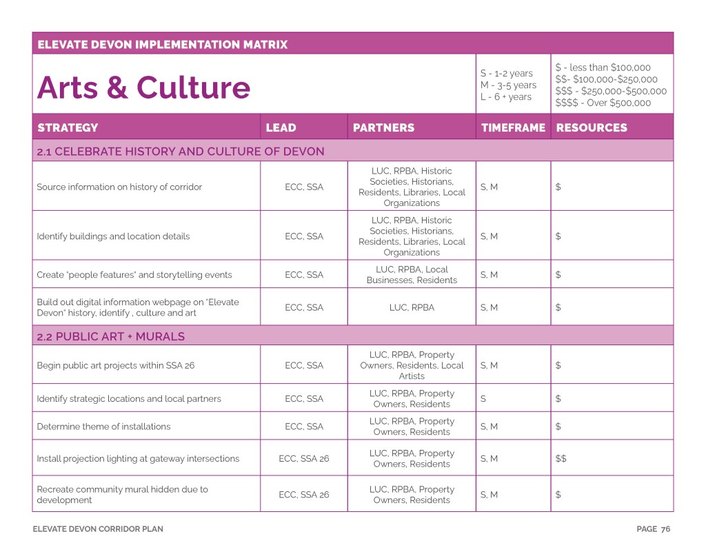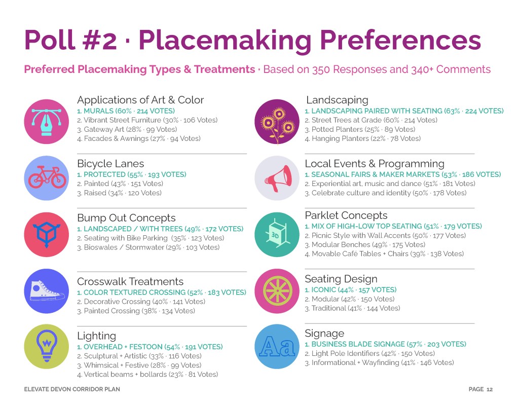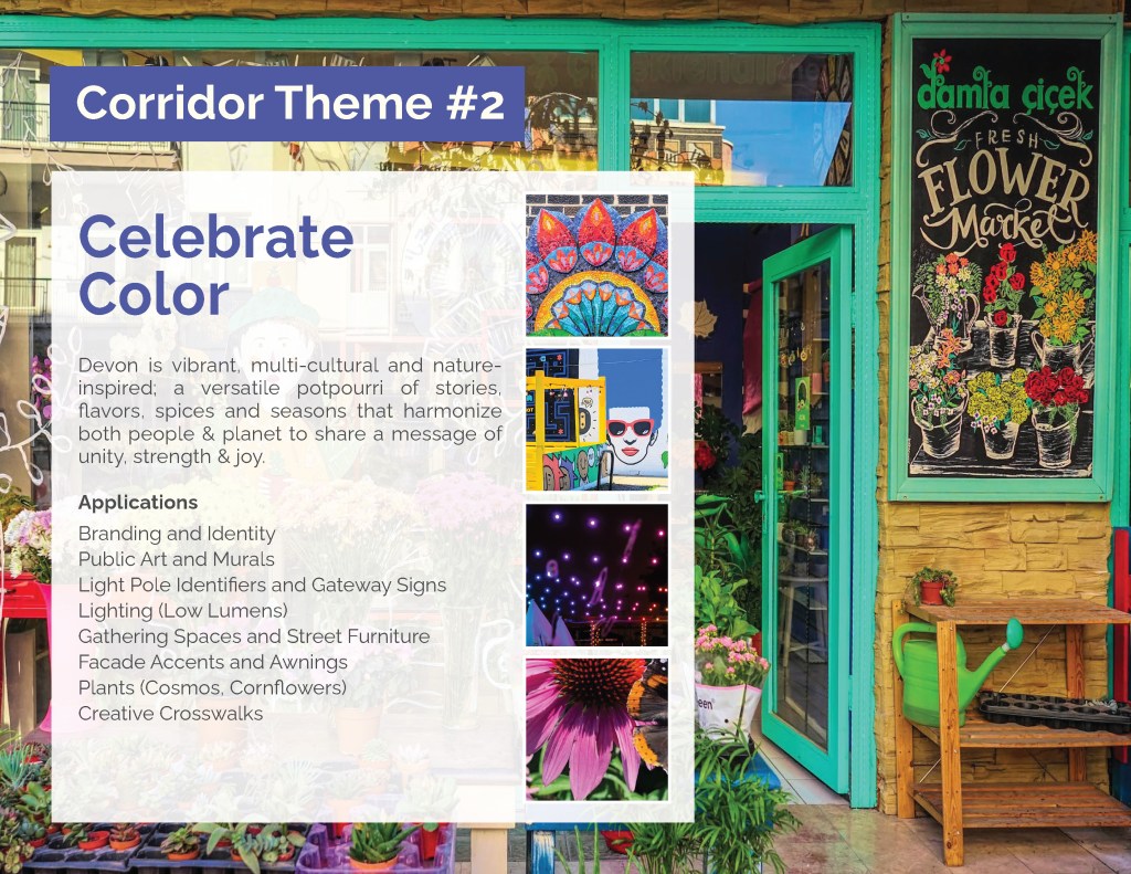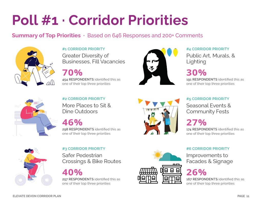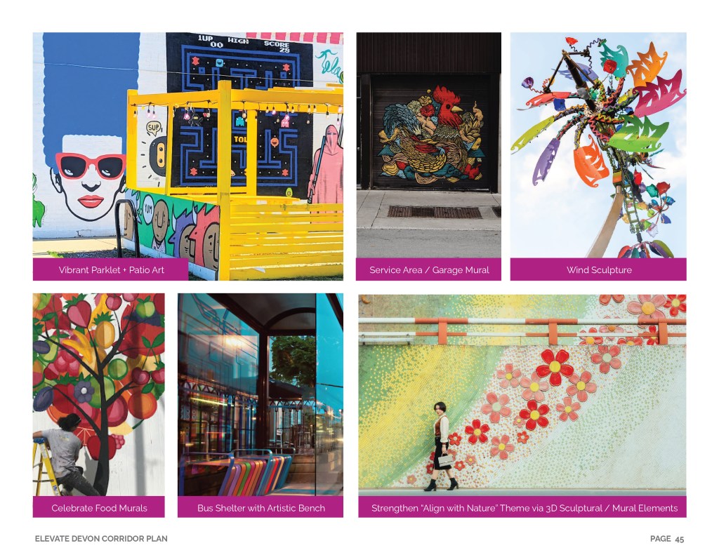 The Elevate Devon Corridor Plan will bring a series of strategic improvements including a branding initiative, arts and culture development, business activation, streetscape safety infrastructure, placemaking and landscaping. For more detail, please click the button below and explore the full plan document.