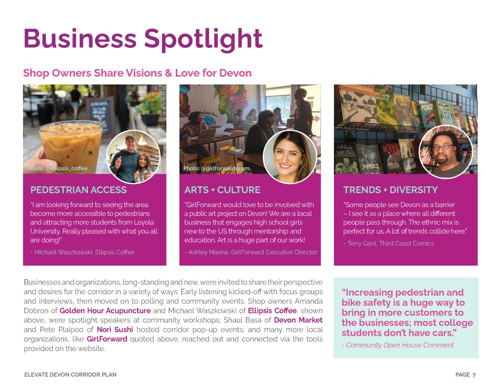 “The Elevate Devon planning process has helped build stronger connections within the community groups that coalesce in corridor, and now that it’s completed, the real work begins. While part of the plan includes creating a cohesive identity for the corridor, others involve a better pedestrian experience and programming that celebrates the culture reflected in the businesses on the street.”