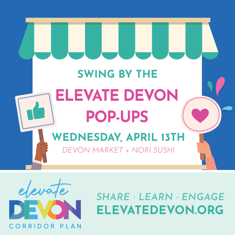 The Elevate Devon Pop Up Tour is just getting started! Be sure to visit us on April 13th at Nori Sushi in the outdoor patio from 2:30 to 4pm, and at Devon Market near the entrance from 4:30 to 6pm. Whether you’re getting a California Roll, stopping by to pick up some produce, or just in the neighborhood, slow your roll and share your feedback! These pop ups are an opportunity for you to identify priorities for different projects on Devon.