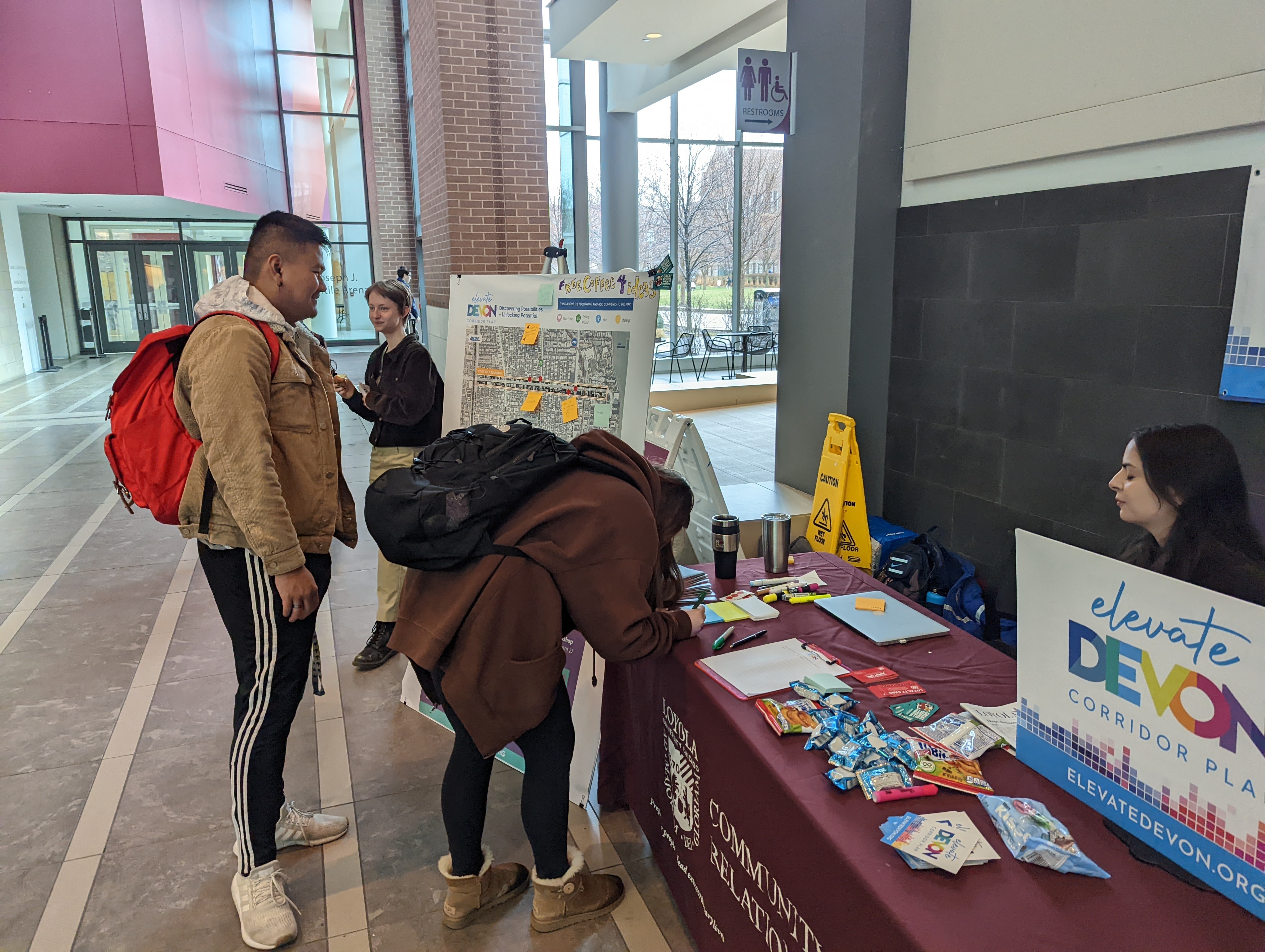 Hey there! We’re your Elevate Devon Student Ambassadors, Riley Kelly and Mia Roman. We hosted the first pop-up in Loyola University Chicago’s Damen Student Center on Thursday, March 31st from 9 am to 12 pm and it was a huge success! We were able to connect with more than fifty students and collected dozens of insights and comments about what they wanted to see in the Devon corridor, their ideas, and challenges. After our tabling, website hits increased more than 1,000%. We were delighted to have lots of enthusiastic conversations with students who were interested in contributing their thoughts on how to improve the area.
