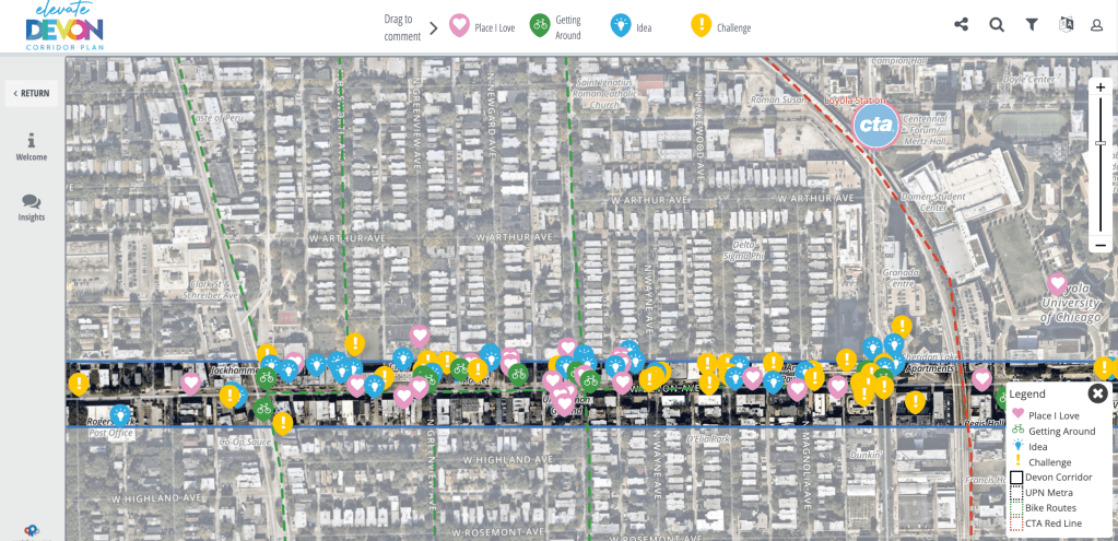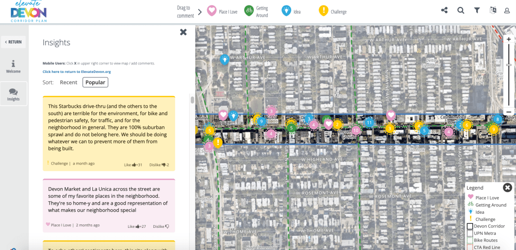 We’re famous 🥳 (sort of)! A big thank you to Block Club Chicago for the great article on Elevate Devon. Maybe some of you reading this were brought here from the Block Club article – welcome! We are happy to report the Elevate Devon Starter Poll has received a whopping 600+ responses and the Comment Map has more than 150+ insights. What’s better? Ideas keep rolling in. Read on!